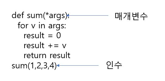 매개변수 앞에 *args 이런식으로 만들어 주면 튜플로 반환해 준다.